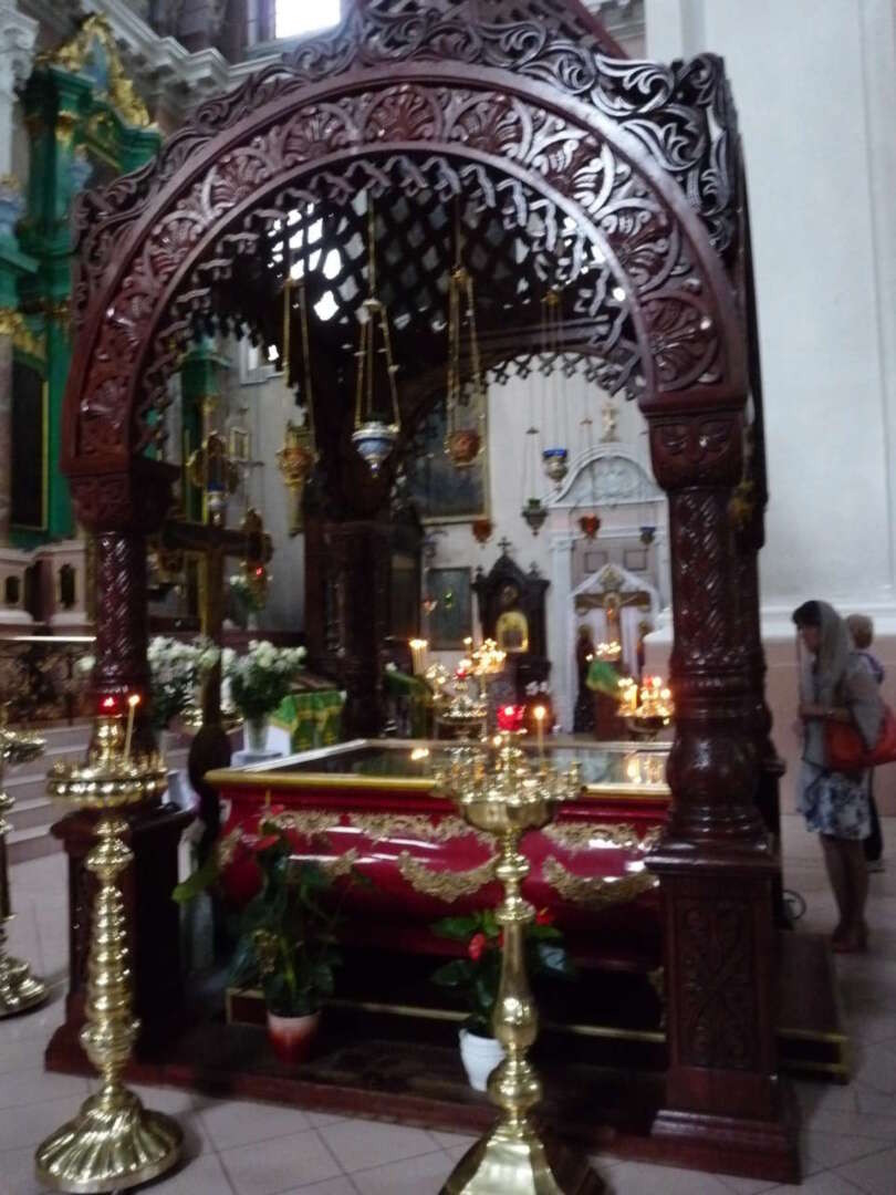 W nawie głównej pod baldachimem znajdują się relikwie trzech pierwszych prawosławnych świętych Litwy